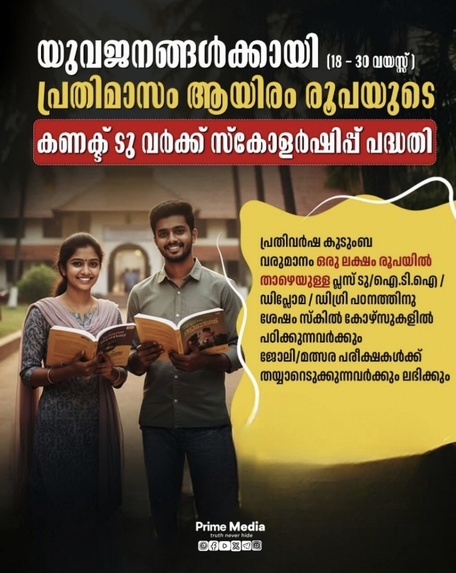യുവജനങ്ങൾക്കായി (18 – 30 വയസ്സ് ) പ്രതിമാസം ആയിരം രൂപയുടെ ‘കണക്ട് ടു വർക്ക് സ്കോളർഷിപ്പ് ‘ പദ്ധതി. പ്രതിവർഷ കുടുംബ വരുമാനം ഒരു ലക്ഷം രൂപയിൽ താഴെയുള്ള പ്ലസ് ടു/ഐ.ടി.ഐ / ഡിപ്ലോമ / ഡിഗ്രി പഠനത്തിനു ശേഷം സ്കിൽ കോഴ്സുകളിൽ പഠിക്കുന്നവർക്കും ജോലി/മത്സര പരീക്ഷകൾക്ക് തയ്യാറെടുക്കുന്നവർക്കും ലഭിക്കും.