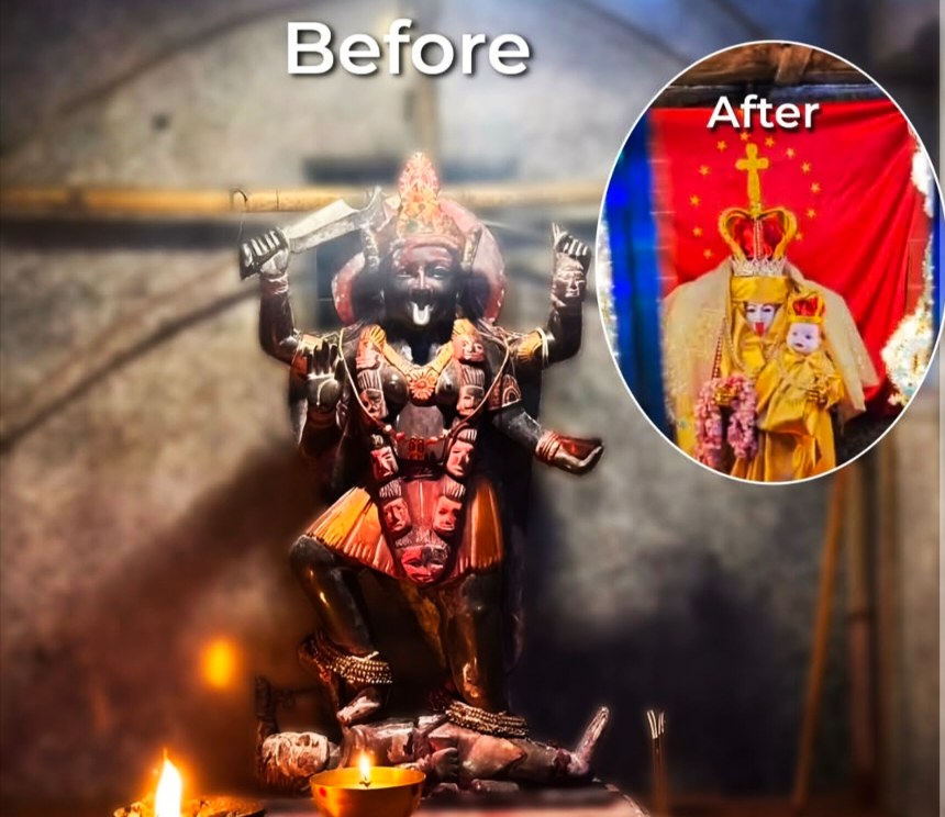 ക്ഷേത്രത്തിനുള്ളിൽ നിന്ന് ഒരു ഭക്തൻ പകർത്തിയ വീഡിയോ ഇതിനോടകം സോഷ്യൽ മീഡിയയിൽ വൈറലായി. ”ഇത് കാളീ ദേവിയുടെ ക്ഷേത്രമാണ്. ക്രിസ്ത്യൻ മിഷണറികളായ ആളുകൾ എന്താണ് ചെയ്തിരിക്കുന്നതെന്ന് നോക്കൂ. ദേവിയെ കുരിശു ധരിപ്പിച്ചിരിക്കുകയാണ്,” വീഡിയോ പകർത്തിയ ആൾ പറയുന്നത് കേൾക്കാം. കാളീ ദേവിയുടെ യഥാർത്ഥ പ്രതിമയുടെ ചിത്രങ്ങളും വീഡിയോയിൽ ഉൾപ്പെടുത്തിയിട്ടുണ്ട്.
